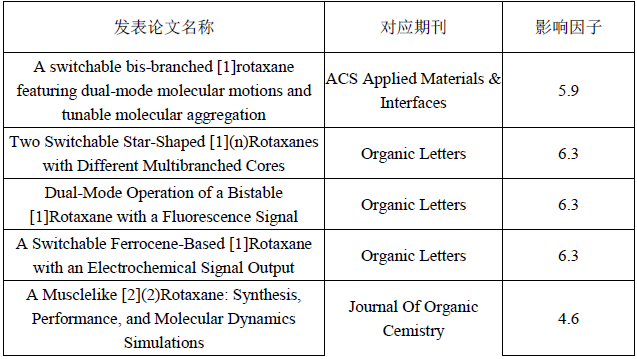 从研究生第二学期开始,我就主要在实验室从事二茂铁的[1]轮烷分子机器、一氧化氮分子探针以及新型模板法合成大环索烃等课题的研究工作。到目前为止,课题已经取得一定成功,其中一篇研究二茂铁的电化学[1]轮烷分子梭已于2012年在Organic Letters上所发表;一篇基于二茂铁的INHIBIT分子逻辑门[1]轮烷分子梭已于2013年在Organic Letters上所发表;一篇以苝酰亚胺荧光团为中心的双支[1]轮烷分子梭研究其分子聚集形态变化的体系已于2014年在ACS Applied Materials & Interfaces上所发表;以及三支-四支对称的基于二茂铁的[1]轮烷分子梭和以蒽双冠醚为大环组装的[2](2)轮烷分子梭体系分别使用分子动力学模拟了目标体系在不同状态下的具体构型,并分别于2014年在Organic Letters和Journal of Organic Chemistry上面所发表。