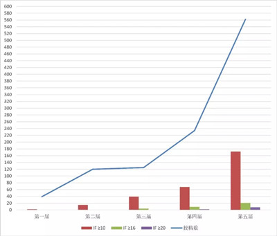 “阿达玛斯”学术论文奖,已持续举办五届,投稿数逐年增长,从第一届的100篇到第五届的562篇,增长了462%,投稿论文质量更是一年比一年高,到了第五届,影响因子10以上的已达172篇,创历史新高。