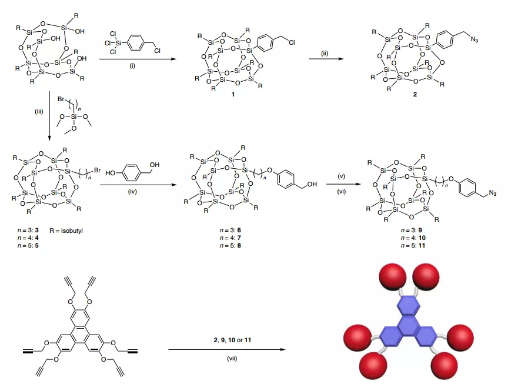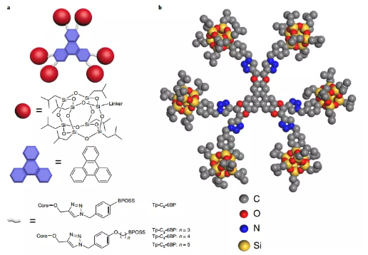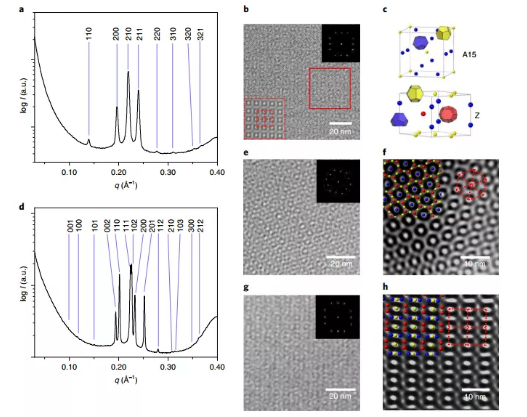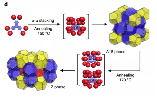 基于苯并菲与笼型倍半硅氧烷(POSS)的巨型形状两亲体合成过程在该系列巨型形状两亲体中,样品Tp-C0-6BP在150℃退火,形成了A15相;将退火温度提高到170℃,该样品则形成了Z相。小角X射线散射技术与透射电子显微镜技术从倒易空间与正空间中充分的证实了Z相的形成。此外,Z相可以直接由无序状态在170℃退火直接形成,无需经历A15相。Z相可以在150℃中退火相变为A15相。这些现象充分表明A15相到Z相的相变是典型的Enantiotropic相变。更进一步,研究者研究了A15相与Z相之间的相变机理。从分子层面,A15相中,每个球状基元含有四个分子,而Z相中的球状基基元则部分含有三个分子,部分含有四个分子。这满足了Z相对于球状基元之间较大的体积比的要求。在相变过程中,随着退火温度的升高,POSS产生一定程度的热膨胀,与此同时苯并菲之间的π-π堆叠作用在减弱,两者的共同作用使得分子可以逃逸出原有的球状基元进行调整 。从晶格层面,Z相是由A15相在(001)方向产生了矢量为[√3/2, 1/2, 0]的位移位移所得,透射电子显微镜数据佐证了该机理。其余分子的自组装行为与更多细节在原文中有相应的描述。