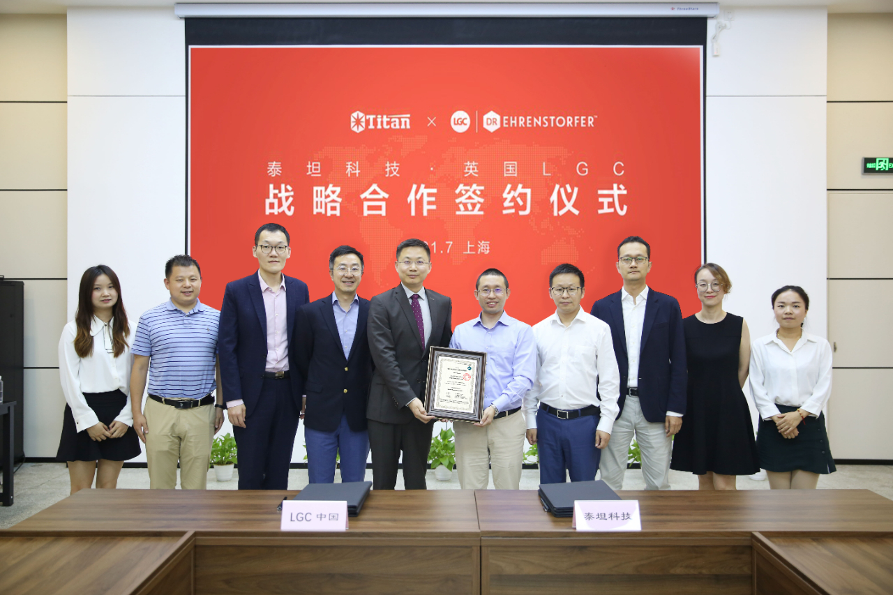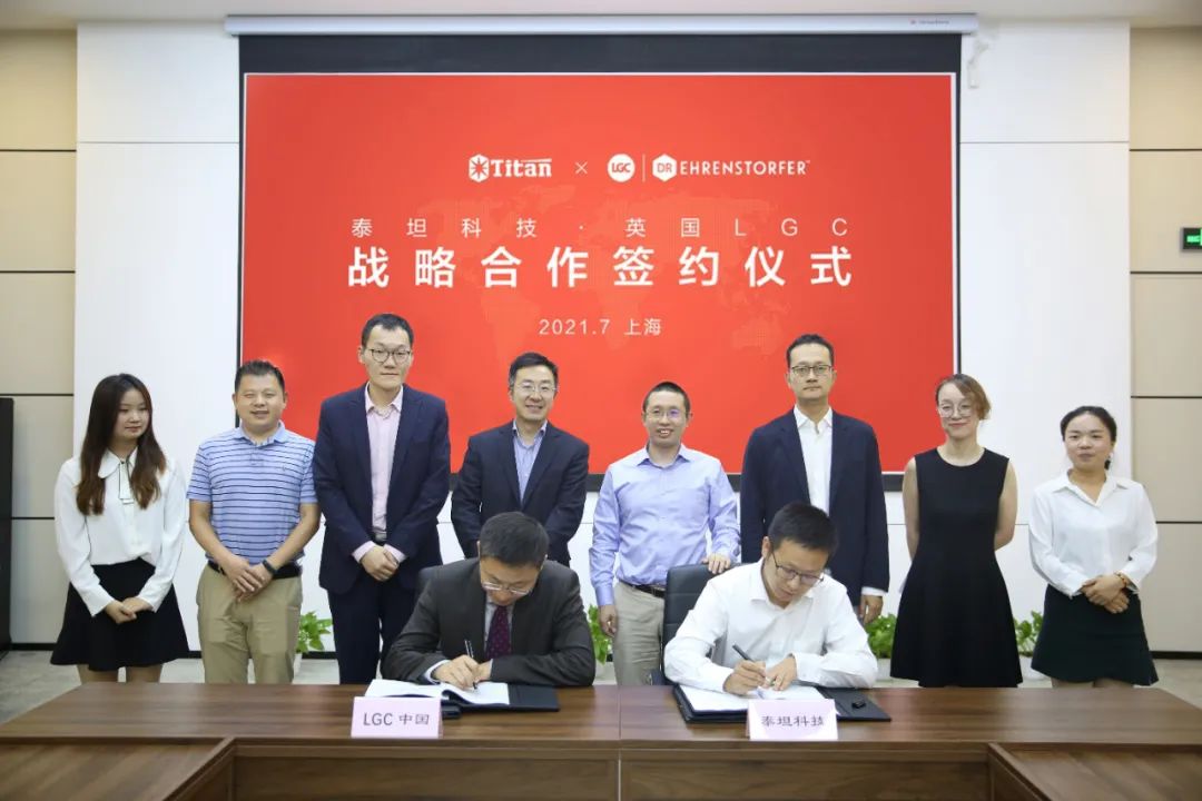 2021年7月28日,上海泰坦科技股份有限公司与LGC中国战略合作签约仪式在泰坦科技总部举行,泰坦科技董事长谢应波博士,LGC标准品中国区总经理孔祥锋先生率领双方团队共同出席签约仪式。