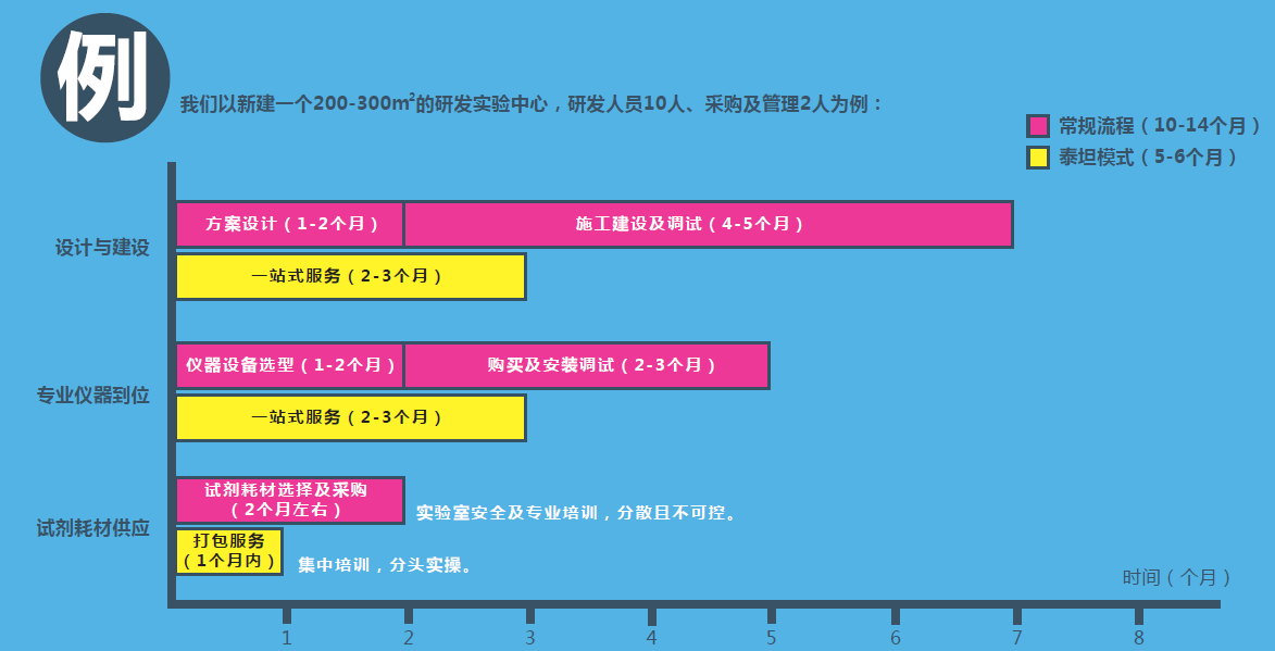 我们以新建一个200-300m2的研发实验中心为例,从方案设计、施工建设及调试到最终试剂耗材到位大约需要10-14个月的时间,如果有幸你找到了一家像泰坦科技(Titan)这样的科研服务一站式的提供商,这个时间会大大缩减。据保守估计,通过泰坦(Titan)的科研一站式服务,可至少减少50%的时间成本,节约直接成本超过15%,节约间接成本80—100万元。